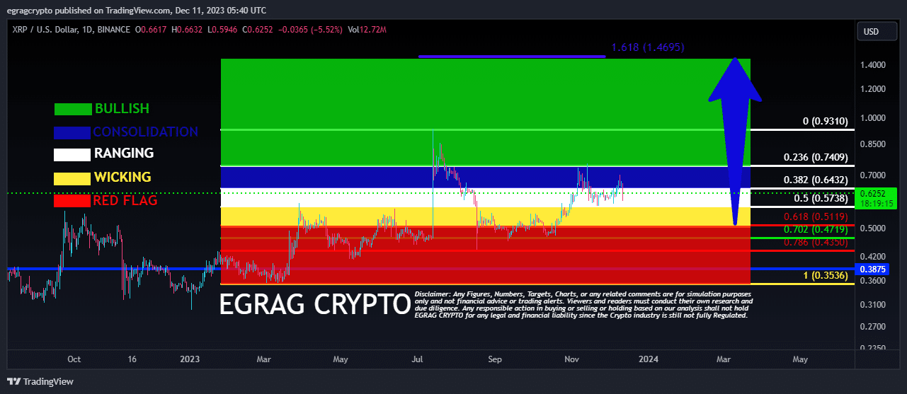 The last territory is a green area called the Bullish zone, the most extensive region. This area spans $0.7409 through the ultimate price target of $1.4. Trading for $0.6230 at the reporting time XRP currently sits within the Ranging zone.