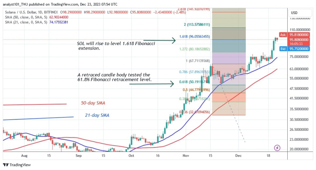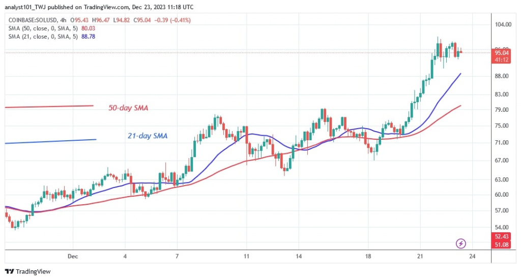 The price of the cryptocurrency is currently oscillating below its recent high. Nonetheless, the cryptocurrency value has entered the overbought zone of the market. It is unlikely that the cryptocurrency will continue to rise. If buyers keep the price above $100, the market will reach a high of $120. If the recent high is rejected, Solana will fall above the 21-day SMA or the $75 low. Moreover, the current uptrend will end if the price of the cryptocurrency falls below the 21-day SMA. At the time of writing, Solana is worth $95.80.