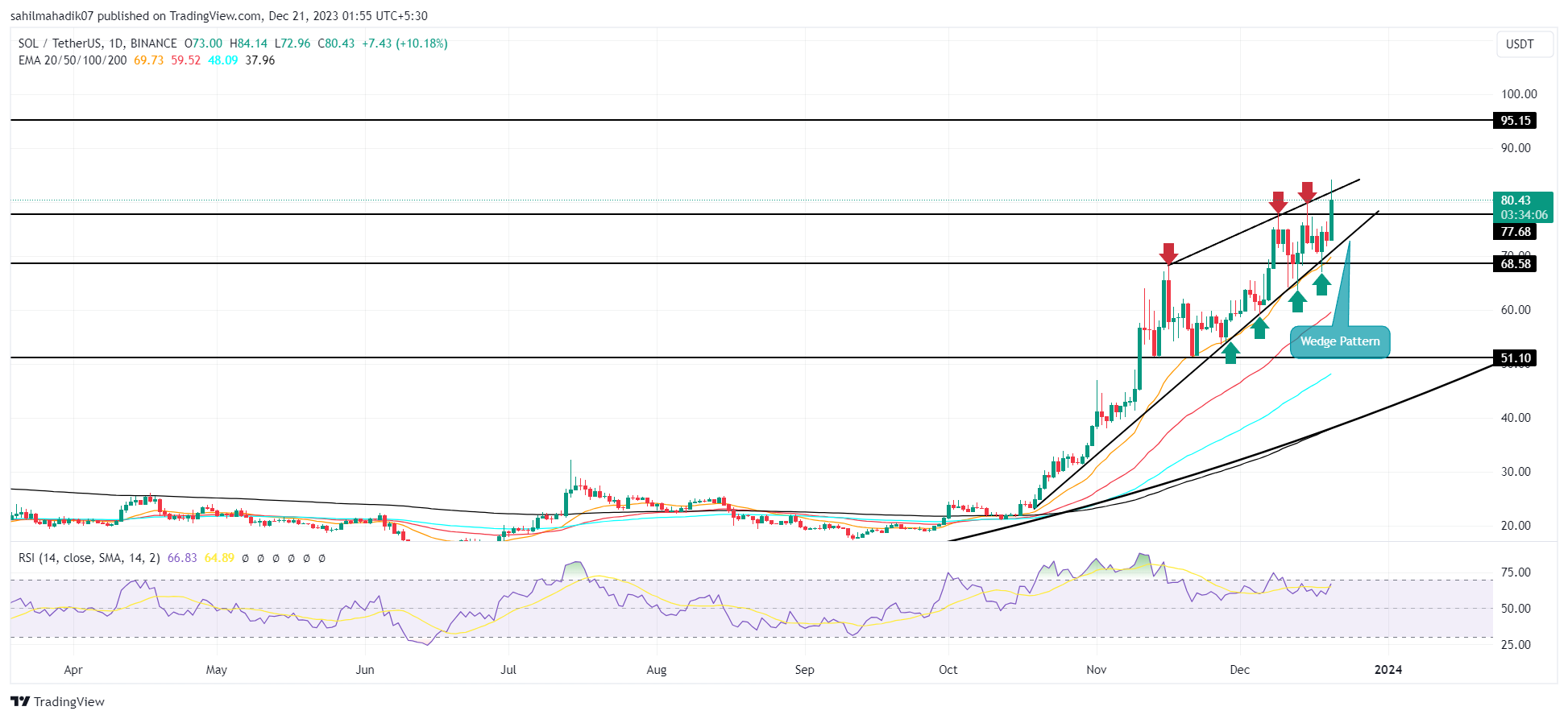 Solana Price Prediction: Amid the current uncertainty in the crypto market and the development of a rising wedge pattern, the Solana price showed a restricted recovery. Over the past five weeks, the pattern’s converging trendlines provided dynamic resistance and support to ongoing rallies. However, today’s SOL price witnessed a significant inflow which teases an upside breakout from the wedge paving the way for further rally.
