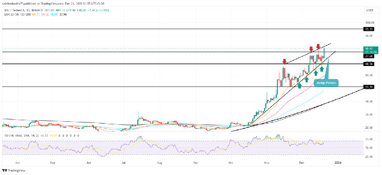 Thus, the SOL price continues strong on its recovery rally with no major sign of weakness. With an intragain of 144, the coin price has recently breached the resistance trendline of a rising wedge pattern.