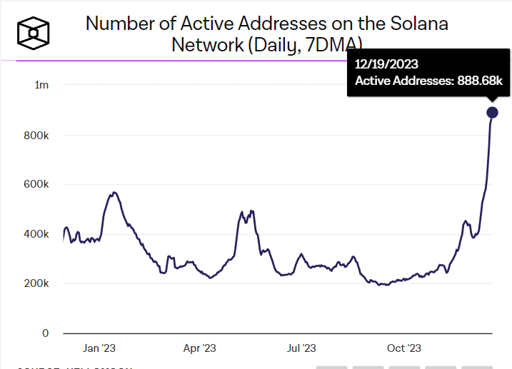 The cryptocurrency sector often relies on Activity addresses as a crucial measure to understand its fundamental growth. These addresses offer a clear view of user engagement and the overall acceptance of the sector. Recent data from IntoTheBlock, a prominent analytics company, shows a significant increase in activity on the Solana network. Starting from a low of 83.93K in mid-October, the number of active Solana addresses has rocketed to 351.5K, a peak that hasn’t been reached since June 2022. This dramatic rise underscores a substantial boost in interest and participation in the Solana ecosystem.