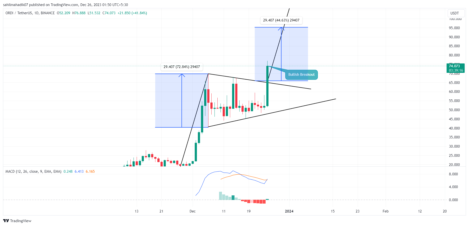 A look at the daily time frame chart shows this consolidation as the formation of a bullish pennant pattern. Today, the ORDI price witnessed a significant inflow, which led to a 41% surge to break past the triangle’s upper trendline.