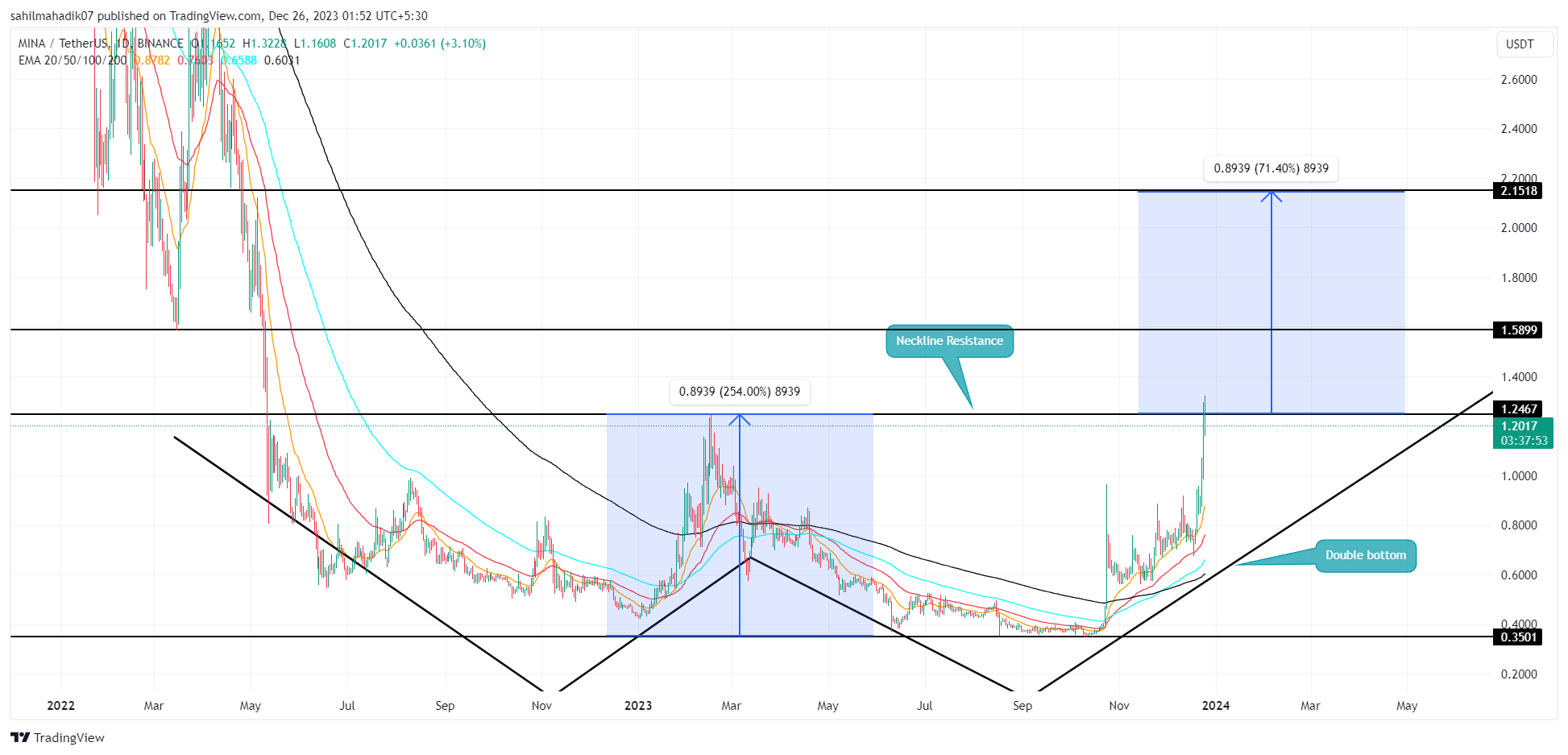 Amid this rise, the coin price has recently showcased a bullish breakout from the $1.24 necklace resistance of a double-bottom pattern. A potential breakout from this level would intensify the buying pressure and may potentially surge Mina Price to chase $1.15.