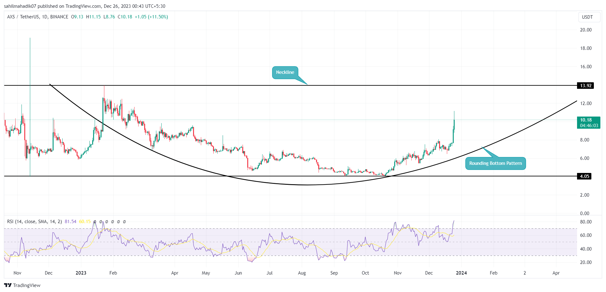 In the daily time frame chart, the Axie infinity (AXS) price shows the formation of a rounding bottom pattern. This reversal pattern in tandem with general bullish momentum, created a strong 9-week rally which surged the AXS price from $4 to the current trading price of $10.12.