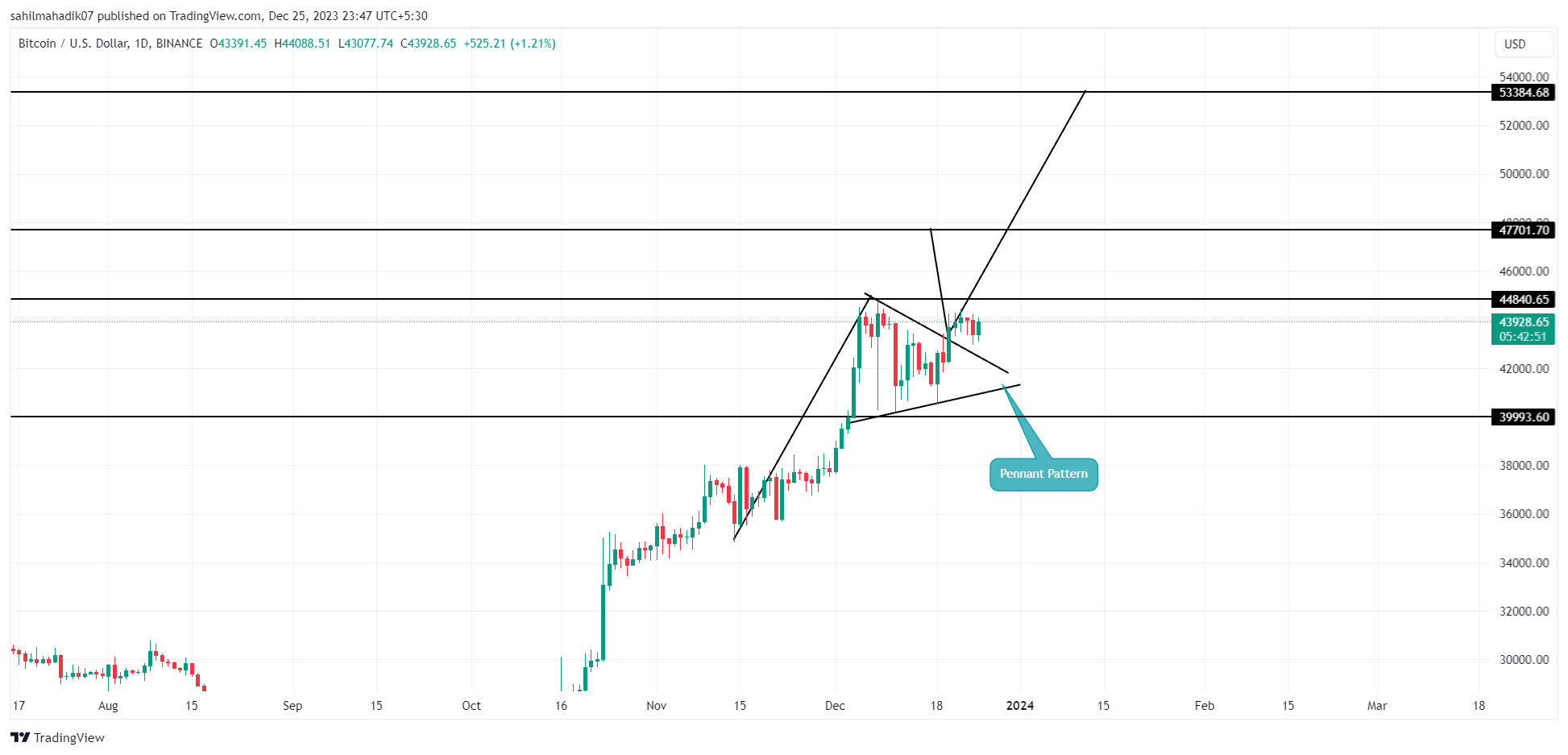 During this sideways period, which typically reflects market indecision, a pennant formation can be observed on the four-hour chart. On December 20th, the Bitcoin price successfully breached the pennant’s resistance line, suggesting a likely continuation of its upward trajectory.