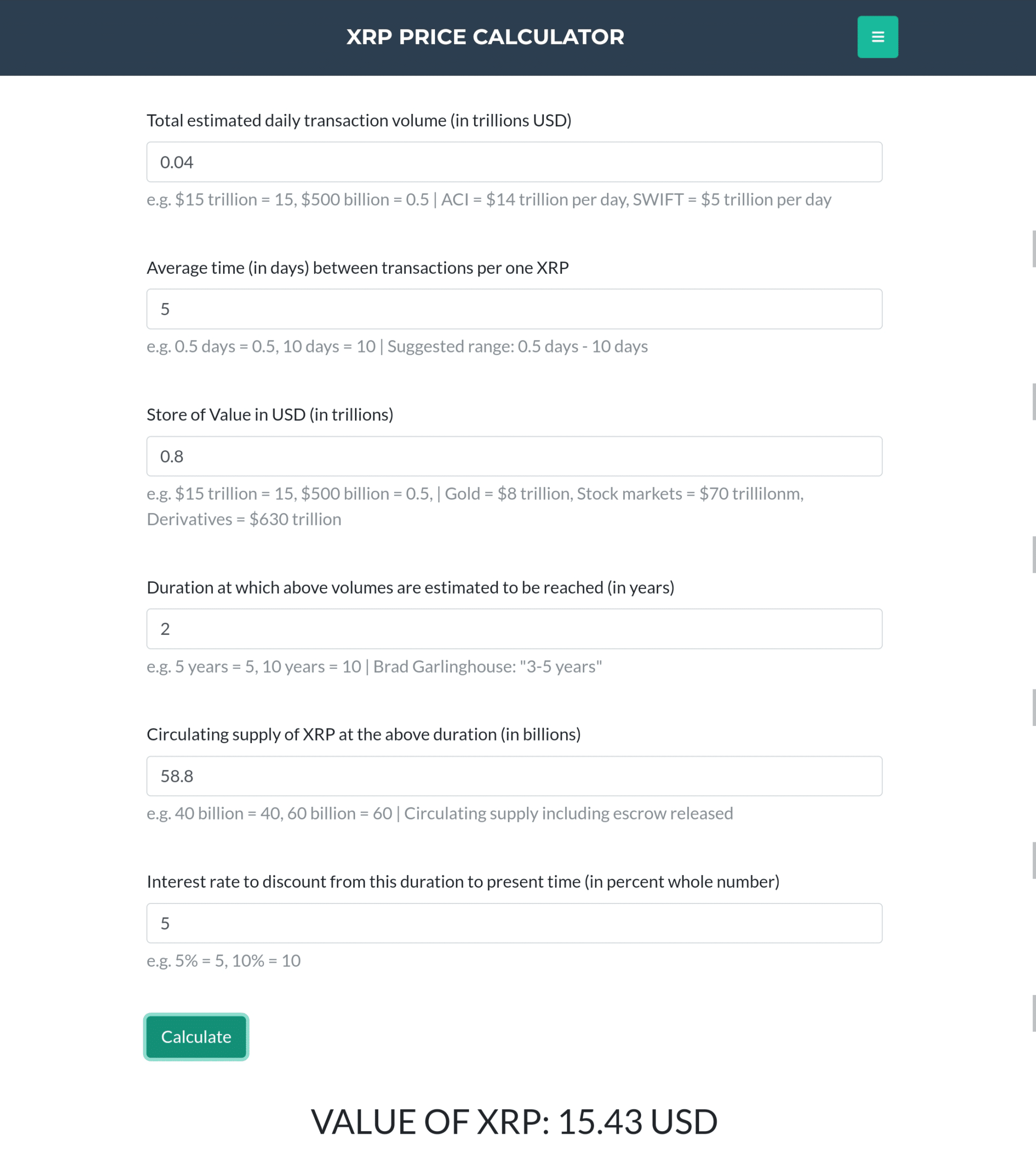 Shortly after Susan and Mitchnick released their evaluation model, a web-based calculator that uses this model surfaced. The Crypto Basic recently leveraged this calculator to estimate XRP value in the next two years, and the tool presented a price of $15.