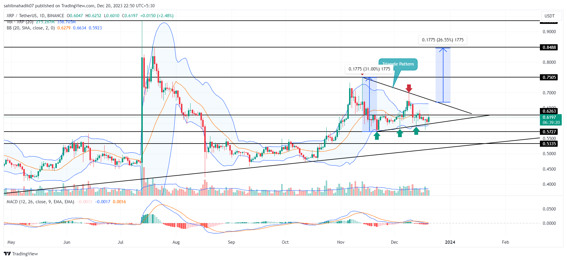 XRP Price Prediction: The third week of December has been highly volatile for the 5th largest cryptocurrency XRP. while the wavering price projected no dominance from bull or bear, it showcased suitability above the $0.6 psychological support. This horizontal level aligned with the support trendline of the triangle pattern setup increasing the XRP price potential to rebound higher.