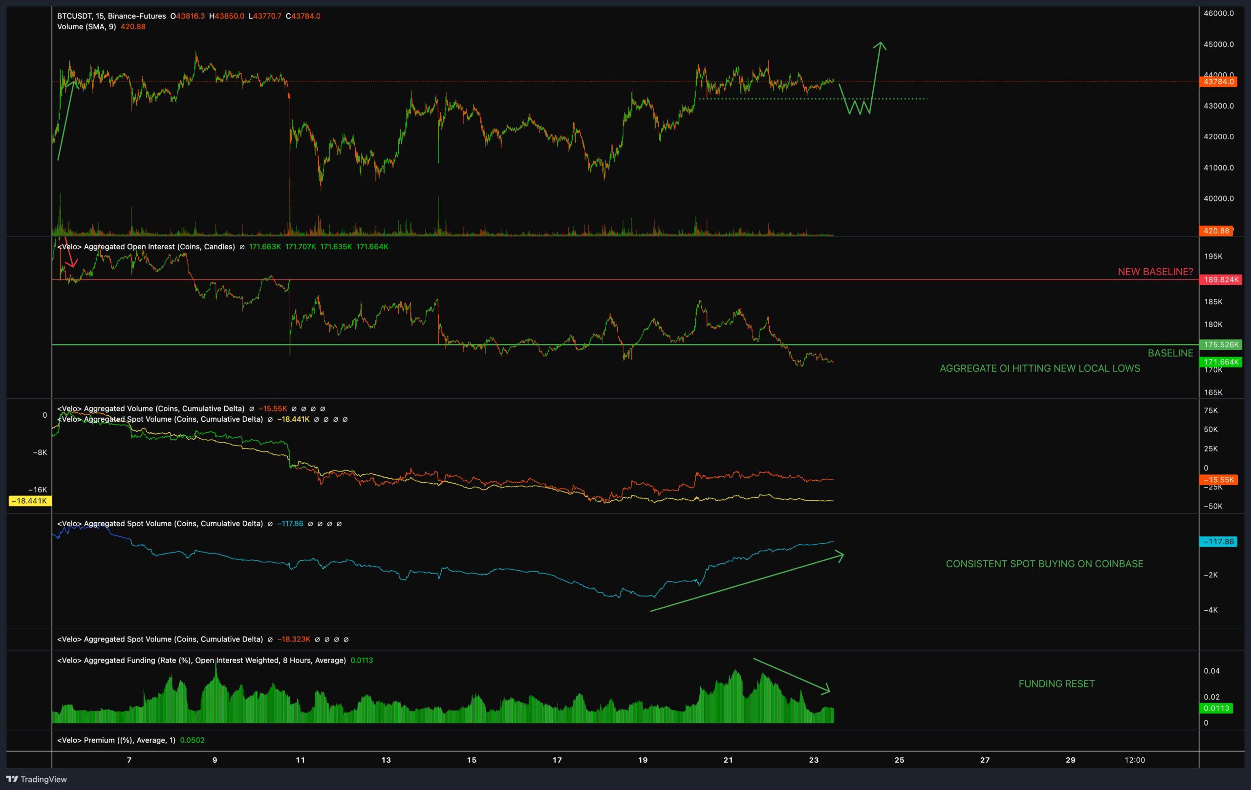 For his reasoning, he noted the increase in spot buying on Coinbase, the reset of funding, and the decrease in open interest.